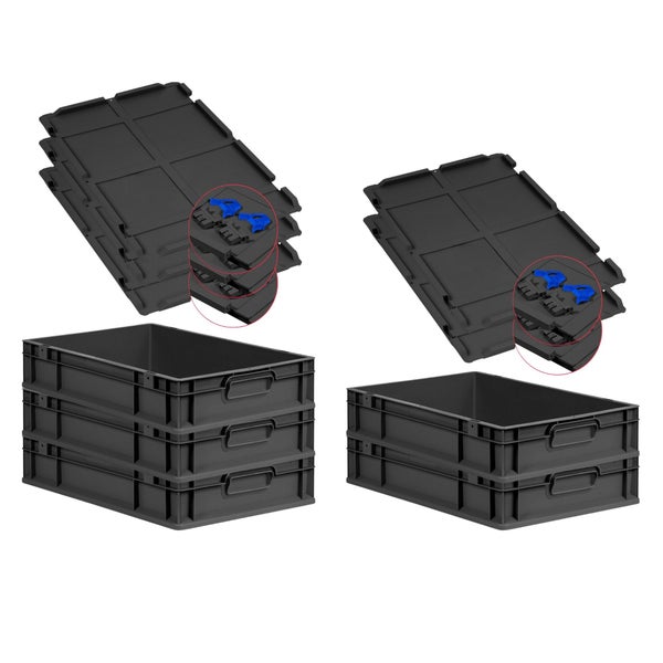 PROREGAL SuperSparSet 5x Eurobox NextGen Grip mit Scharnierdeckel und blauen Schiebeschnappverschlüssen, HxBxT 12x40x60cm, 23 Liter, Schwarz, Griffe geschlossen, Eurobehälter, Transportbox, Transportbehälter, Stapelbehälter