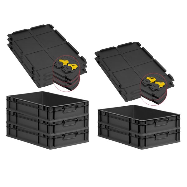 PROREGAL SuperSparSet 5x Eurobox NextGen Grip mit Scharnierdeckel und gelben Schiebeschnappverschlüssen, HxBxT 12x40x60cm, 23 Liter, Schwarz, Griffe geschlossen, Eurobehälter, Transportbox, Transportbehälter, Stapelbehälter