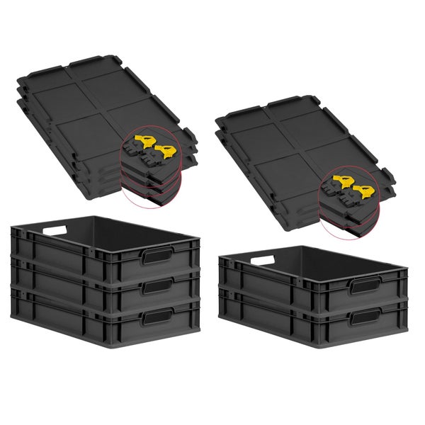 PROREGAL SuperSparSet 5x Eurobox NextGen Grip mit Scharnierdeckel und gelben Schiebeschnappverschlüssen, HxBxT 12x40x60cm, 23 Liter, Schwarz, Griffe offen, Eurobehälter, Transportbox, Transportbehälter, Stapelbehälter