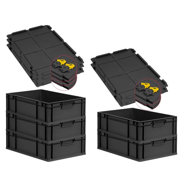 PROREGAL SuperSparSet 5x Eurobox NextGen Grip mit Scharnierdeckel und gelben Schiebeschnappverschlüssen, HxBxT 17x40x60cm, 34 Liter, Schwarz, Griffe geschlossen, Eurobehälter, Transportbox, Transportbehälter, Stapelbehälter