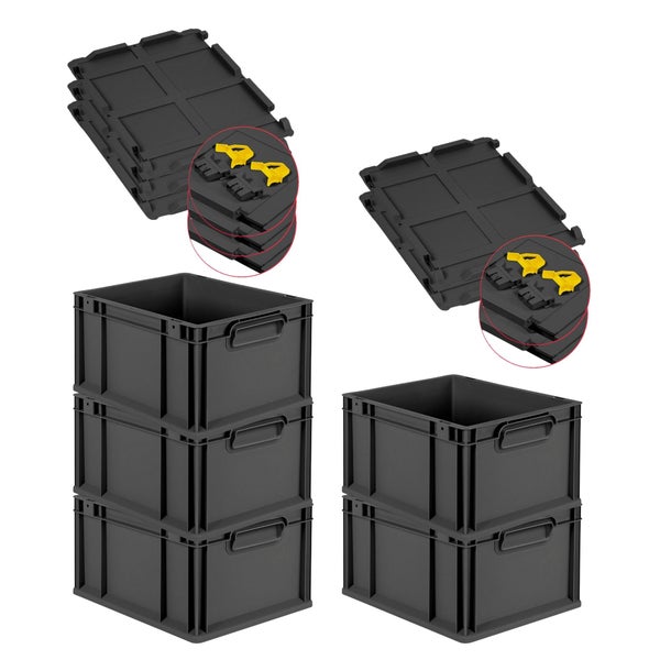 PROREGAL SuperSparSet 5x Eurobox NextGen Grip mit Scharnierdeckel und gelben Schiebeschnappverschlüssen, HxBxT 22x30x40cm, 20 Liter, Schwarz, Griffe geschlossen, Eurobehälter, Transportbox, Transportbehälter, Stapelbehälter