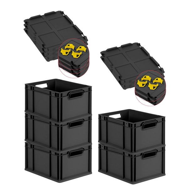 PROREGAL SuperSparSet 5x Eurobox NextGen Grip mit Scharnierdeckel und gelben Schiebeschnappverschlüssen, HxBxT 22x30x40cm, 20 Liter, Schwarz, Griffe offen, Eurobehälter, Transportbox, Transportbehälter, Stapelbehälter