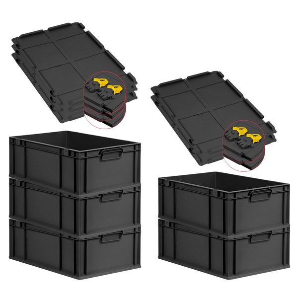 PROREGAL SuperSparSet 5x Eurobox NextGen Grip mit Scharnierdeckel und gelben Schiebeschnappverschlüssen, HxBxT 22x40x60cm, 44 Liter, Schwarz, Griffe geschlossen, Verstärkter Boden, Eurobehälter, Transportbox, Transportbehälter, Stapelbehälter
