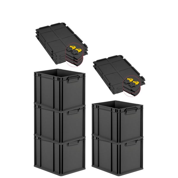PROREGAL SuperSparSet 5x Eurobox NextGen Grip mit Scharnierdeckel und gelben Schiebeschnappverschlüssen, HxBxT 32x30x40cm, 30 Liter, Schwarz, Griffe geschlossen, Eurobehälter, Transportbox, Transportbehälter, Stapelbehälter