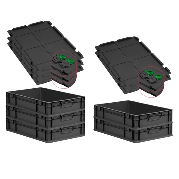 PROREGAL SuperSparSet 5x Eurobox NextGen Grip mit Scharnierdeckel und grünen Schiebeschnappverschlüssen, HxBxT 12x40x60cm, 23 Liter, Schwarz, Griffe geschlossen, Eurobehälter, Transportbox, Transportbehälter, Stapelbehälter