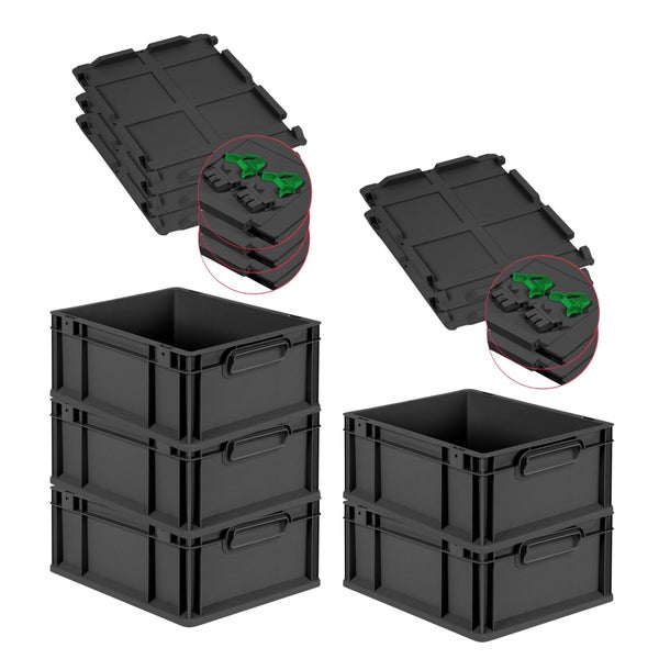 PROREGAL SuperSparSet 5x Eurobox NextGen Grip mit Scharnierdeckel und grünen Schiebeschnappverschlüssen, HxBxT 17x30x40cm, 16 Liter, Schwarz, Griffe geschlossen, Eurobehälter, Transportbox, Transportbehälter, Stapelbehälter