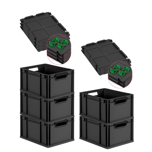 PROREGAL SuperSparSet 5x Eurobox NextGen Grip mit Scharnierdeckel und grünen Schiebeschnappverschlüssen, HxBxT 22x30x40cm, 20 Liter, Schwarz, Griffe offen, Eurobehälter, Transportbox, Transportbehälter, Stapelbehälter