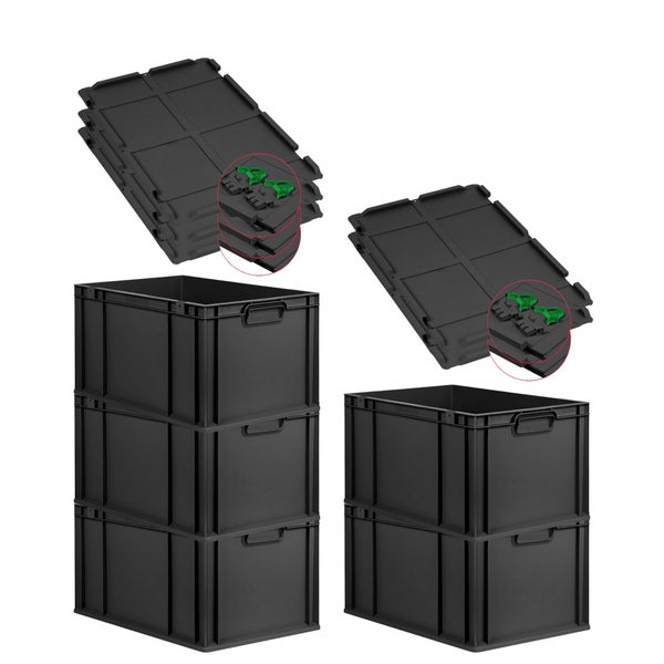 PROREGAL SuperSparSet 5x Eurobox NextGen Grip mit Scharnierdeckel und grünen Schiebeschnappverschlüssen, HxBxT 32x40x60cm, 65 Liter, Schwarz, Griffe geschlossen, Verstärkter Boden, Eurobehälter, Transportbox, Transportbehälter, Stapelbehälter