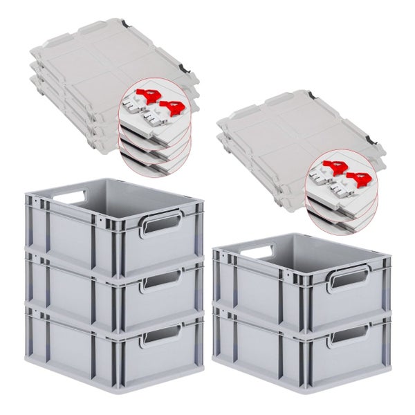 PROREGAL SuperSparSet 5x Eurobox NextGen Grip mit Scharnierdeckel und Roten Schiebeschnappverschlüssen HxBxT 17 x 30 x 40 cm 16 Liter Griffe
