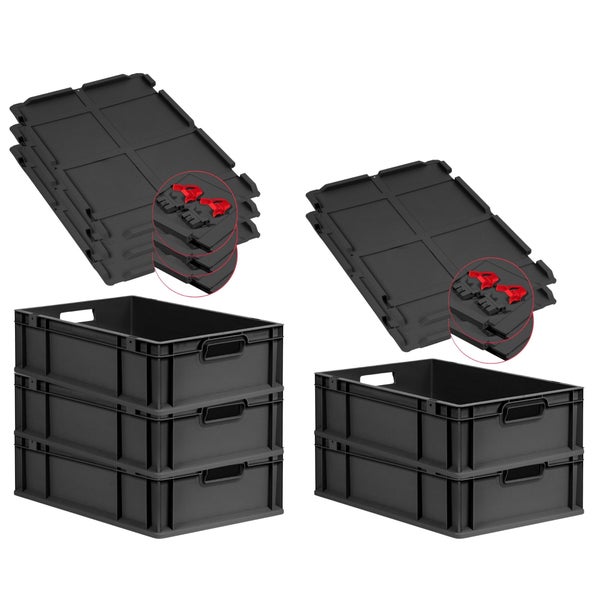 PROREGAL SuperSparSet 5x Eurobox NextGen Grip mit Scharnierdeckel und roten Schiebeschnappverschlüssen, HxBxT 17x40x60cm, 34 Liter, Schwarz, Griffe offen, Eurobehälter, Transportbox, Transportbehälter, Stapelbehälter