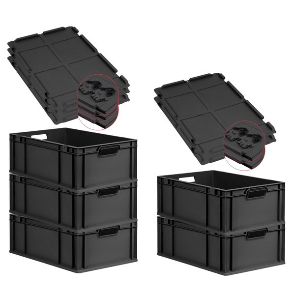PROREGAL SuperSparSet 5x Eurobox NextGen Grip mit Scharnierdeckel und schwarzen Schiebeschnappverschlüssen, HxBxT 22x40x60cm, 44 Liter, Schwarz, Griffe offen, Verstärkter Boden, Eurobehälter, Transportbox, Transportbehälter, Stapelbehälter