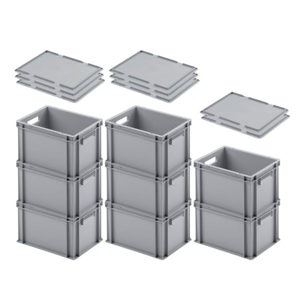 PROREGAL SuperSparSet 8 x Eurobehälter Mit Offenem Griff und Auflagedeckel HxBxT 23,5 x 30 x 40 cm 22 Liter Grau Eurobox Transportbox