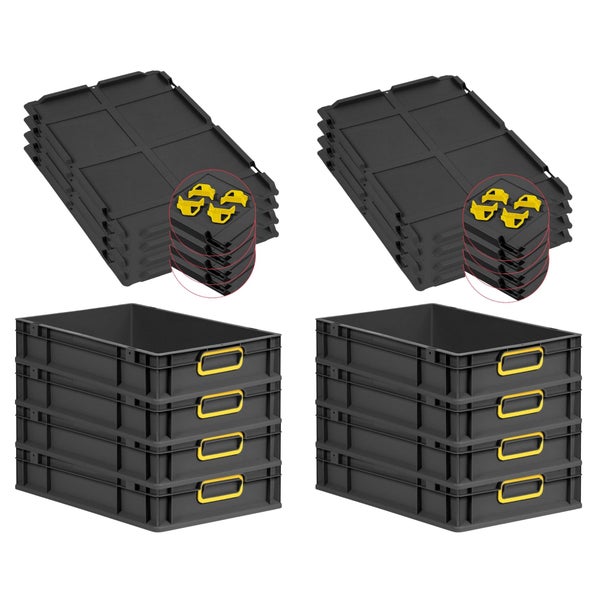 PROREGAL SuperSparSet 8x Eurobox NextGen Color mit Auflagedeckel und Schiebeschnappverschlüsse, HxBxT 12x40x60cm, 23 Liter, Schwarz, Griffe gelb geschlossen, Eurobehälter, Transportbox, Transportbehälter, Stapelbehälter
