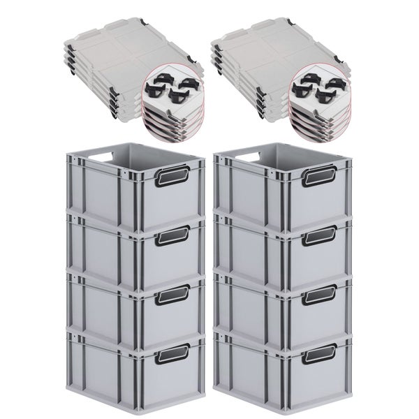 PROREGAL SuperSparSet 8x Eurobox NextGen Color mit Auflagedeckel und Schiebeschnappverschlüsse, HxBxT 22x30x40cm, 20 Liter, Grau, Griffe schwarz offen, Eurobehälter, Transportbox, Transportbehälter, Stapelbehälter