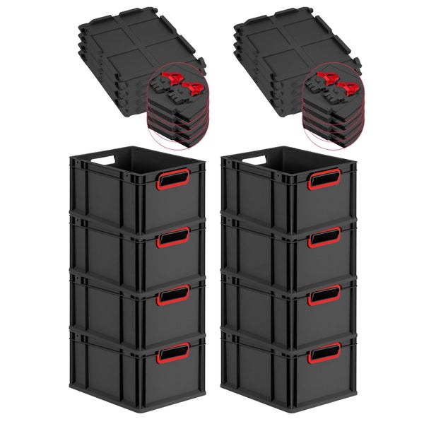 PROREGAL SuperSparSet 8x Eurobox NextGen Color mit Scharnierdeckel und Schiebeschnappverschlüssen, HxBxT 22x30x40cm, 20 Liter, Schwarz, Griffe rot offen, Eurobehälter, Transportbox, Transportbehälter, Stapelbehälter