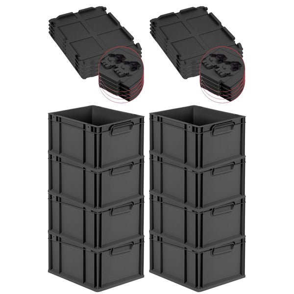 PROREGAL SuperSparSet 8x Eurobox NextGen Color mit Scharnierdeckel und Schiebeschnappverschlüssen, HxBxT 22x30x40cm, 20 Liter, Schwarz, Griffe schwarz geschlossen, Eurobehälter, Transportbox, Transportbehälter, Stapelbehälter