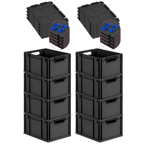 PROREGAL SuperSparSet 8x Eurobox NextGen Grip mit Auflagedeckel inkl. 4 blauen Schiebeschnappverschlüssen, HxBxT 22x30x40cm, 20 Liter, Schwarz, Griffe offen, Eurobehälter, Transportbox, Transportbehälter, Stapelbehälter