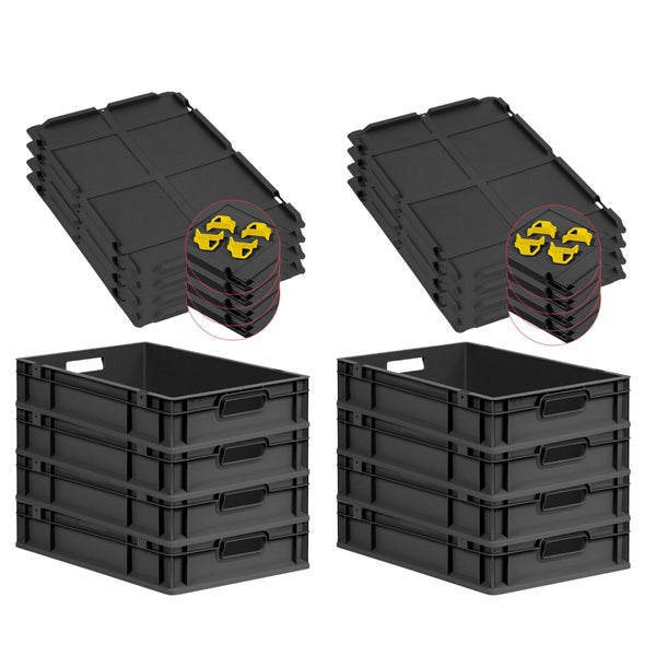 PROREGAL SuperSparSet 8x Eurobox NextGen Grip mit Auflagedeckel inkl. 4 gelben Schiebeschnappverschlüssen, HxBxT 12x40x60cm, 23 Liter, Schwarz, Griffe offen, Eurobehälter, Transportbox, Transportbehälter, Stapelbehälter