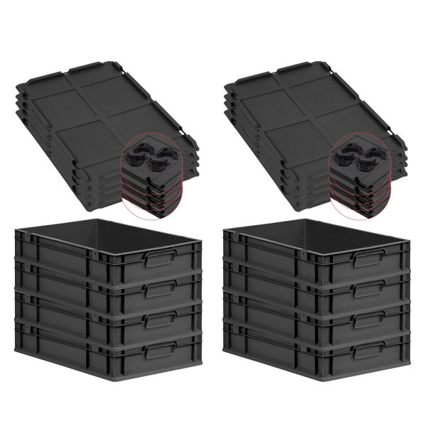 PROREGAL SuperSparSet 8x Eurobox NextGen Grip mit Auflagedeckel inkl. 4 schwarzen Schiebeschnappverschlüssen, HxBxT 12x40x60cm, 23 Liter, Schwarz, Griffe geschlossen, Eurobehälter, Transportbox, Transportbehälter, Stapelbehälter
