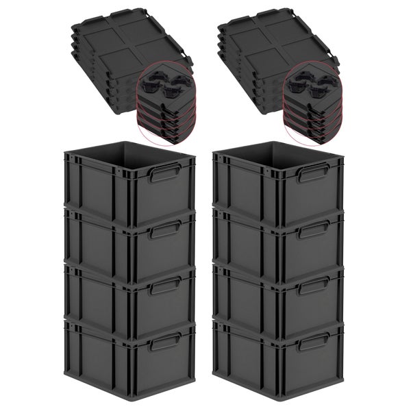 PROREGAL SuperSparSet 8x Eurobox NextGen Grip mit Auflagedeckel inkl. 4 schwarzen Schiebeschnappverschlüssen, HxBxT 22x30x40cm, 20 Liter, Schwarz, Griffe geschlossen, Eurobehälter, Transportbox, Transportbehälter, Stapelbehälter