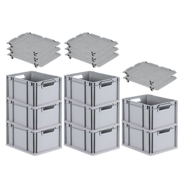 PROREGAL SuperSparSet 8x Eurobox NextGen Grip mit Auflagedeckel mit 4 Schwarzen Schiebeschnappverschlüssen HxBxT 22 x 30 x 40 cm 20 Liter Griffe