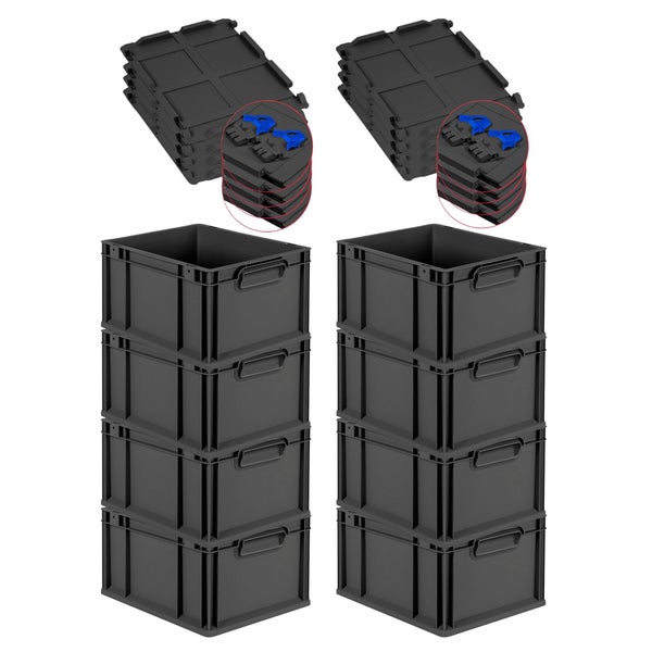 PROREGAL SuperSparSet 8x Eurobox NextGen Grip mit Scharnierdeckel und blauen Schiebeschnappverschlüssen, HxBxT 22x30x40cm, 20 Liter, Schwarz, Griffe geschlossen, Eurobehälter, Transportbox, Transportbehälter, Stapelbehälter