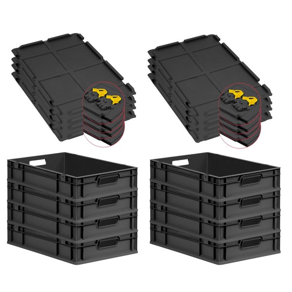PROREGAL SuperSparSet 8x Eurobox NextGen Grip mit Scharnierdeckel und gelben Schiebeschnappverschlüssen, HxBxT 12x40x60cm, 23 Liter, Schwarz, Griffe offen, Eurobehälter, Transportbox, Transportbehälter, Stapelbehälter