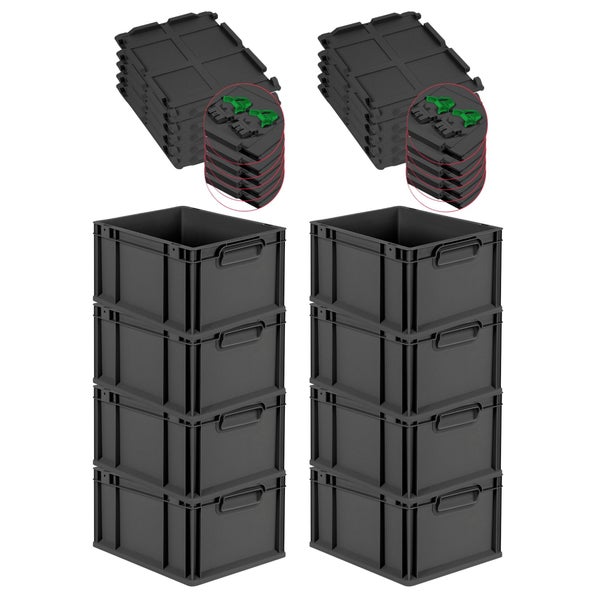 PROREGAL SuperSparSet 8x Eurobox NextGen Grip mit Scharnierdeckel und grünen Schiebeschnappverschlüssen, HxBxT 22x30x40cm, 20 Liter, Schwarz, Griffe geschlossen, Eurobehälter, Transportbox, Transportbehälter, Stapelbehälter