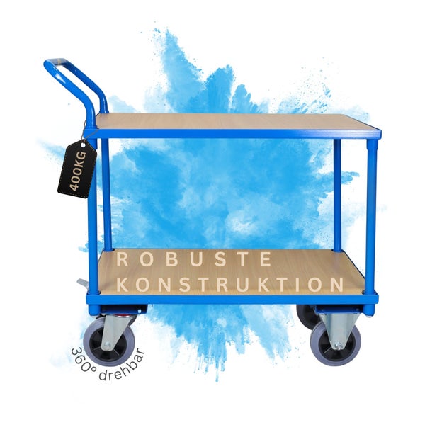PROREGAL Tischwagen mit groüen, sehr leichtgüngigen Rüdern. Ideal bei Produktion/Fertigung, Lager und Logistik, Bühnenbau, Handwerk, sowie Kommissionierung. Das super Handling, die exklusive Materialauswahl, gepaart mit der sauberen und hochwertigen Verarbeitung unterstreichen die PremiumQualität Ihres neuen Transportmittels und lassen eine Gesamtflüchentraglast bis zu 400 kg zu.