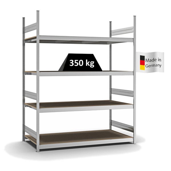 PROREGAL Weitspannregal Stecksystem T-Profil Grundregal HxBxT 250x200x80 cm 4 Ebenen Spanplatten Fachboden Fachlast 350 kg Verzinkt