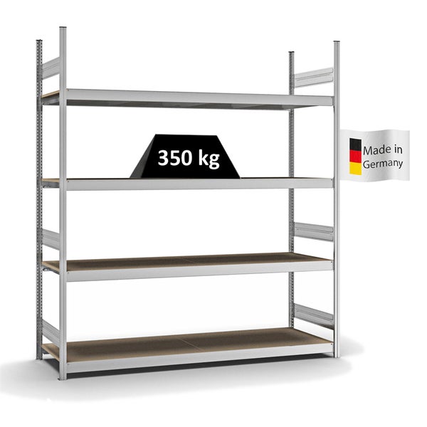 PROREGAL Weitspannregal Stecksystem T-Profil Grundregal HxBxT 250x225x60 cm 4 Ebenen Spanplatten Fachboden Fachlast 350 kg Verzinkt