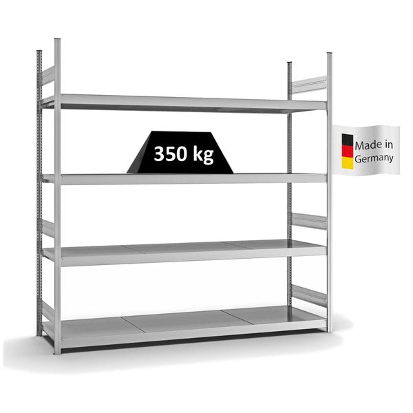 PROREGAL Weitspannregal Stecksystem T-Profil Grundregal HxBxT 250x250x60 cm 4 Ebenen Stahlplatten Fachboden Fachlast 350 kg Verzinkt