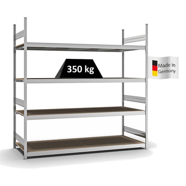 PROREGAL Weitspannregal Stecksystem T-Profil Grundregal HxBxT 250x250x80 cm 4 Ebenen Spanplatten Fachboden Fachlast 350 kg Verzinkt