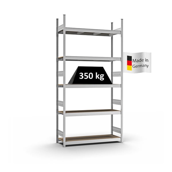 PROREGAL Weitspannregal Stecksystem T-Profil Grundregal HxBxT 300x150x40 cm 5 Ebenen Spanplatten Fachboden Fachlast 350 kg Verzinkt