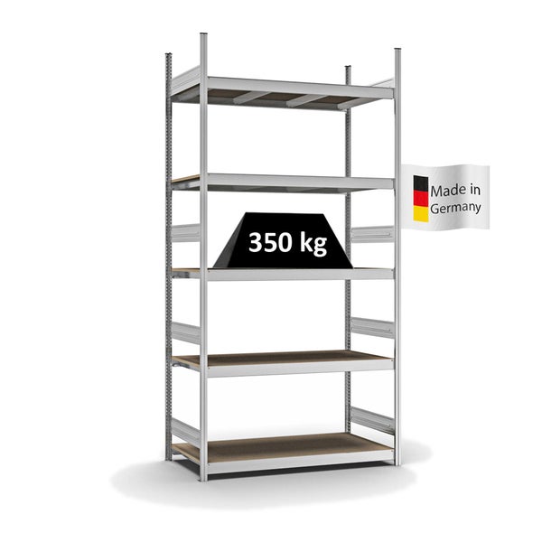 PROREGAL Weitspannregal Stecksystem T-Profil Grundregal HxBxT 300x150x60 cm 5 Ebenen Spanplatten Fachboden Fachlast 350 kg Verzinkt