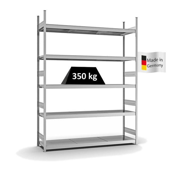 PROREGAL Weitspannregal Stecksystem T-Profil Grundregal HxBxT 300x225x50 cm 5 Ebenen Stahlplatten Fachboden Fachlast 350 kg Verzinkt