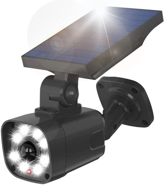 Proxinova Kamera Attrappe Außenbereich, Dummy Kamera Außen Mit Solar Panel, LED Strahler, PIR Solar Fake Kamera, Beleuchtung, LED Glühbirnen, IP65 Wasserdicht [Energieklasse A]