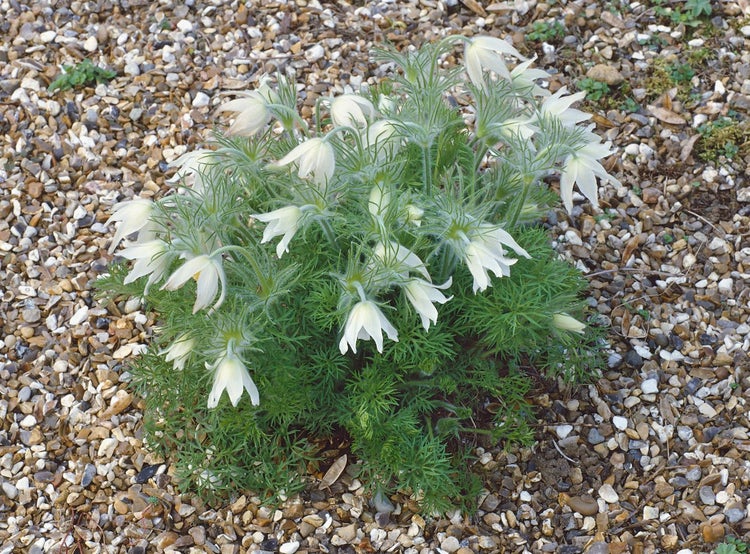 Am besten gedeiht die Küchenschelle an einem sonnigen bis leicht halbschattigen Standort in gut durchlässigem, eher magerem bis kalkhaltigem Boden. Staunässe sollte vermieden werden, ein durchlässiges Substrat mit Sand oder feinem Kies ist vorteilhaft. Die Pflege ist unkompliziert: mäßig gießen, sparsam düngen, verblühte Stängel nach Bedarf zurückschneiden und die attraktiven Samenstände nach Wunsch stehen lassen. Aufgrund der tiefen Pfahlwurzel verpflanzt man die Staude möglichst nicht. Pulsatilla vulgaris ‘Pinwheel Weiß’ harmoniert ausgezeichnet mit frühblühenden Zwiebelpflanzen, kleinen Gräsern und anderen Steingartenstauden und bringt als zeitige Blütenstaude Licht und Struktur in jede Beetgestaltung. Winterhart und langlebig überzeugt sie als vielseitige, pflegeleichte Zierpflanze für natürliche, klare Gartenbilder.