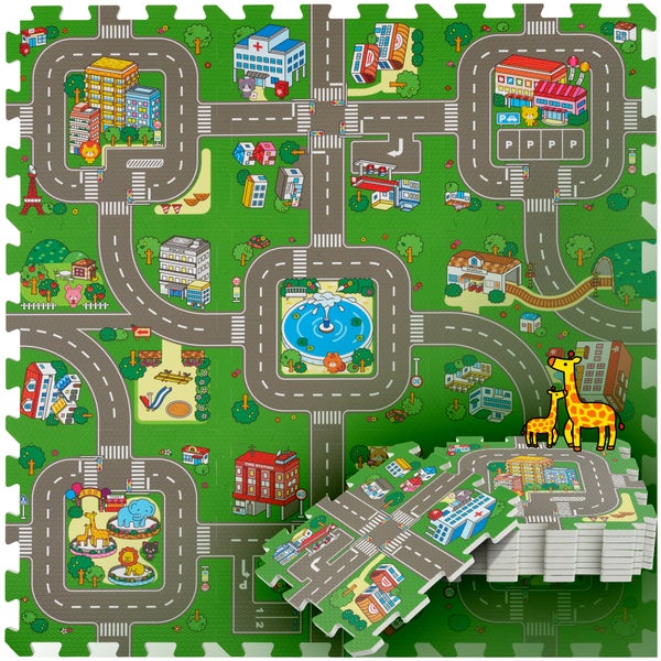 Für kreative AbenteuerEntdecke die Puzzlematte MyCity von tectake mit coolem Stadtmotiv und biete Deinen Kindern maximales Spielvergnügen mit flexibler Gestaltung. Die einzelnen Teile lassen sich einfach zusammensetzen und erlauben dabei verschiedene Möglichkeiten zur Anordnung. Während einige Elemente einen festen Platz im Design haben, können andere individuell kombiniert werden – für neue Welten und grenzenlosen Spaß!Ein echtes Must-haveHergestellt aus hochwertigem EVA-Schaumstoff, überzeugt die Puzzlematte mit ihrer weichen Beschaffenheit. Das Material ist auf Unbedenklichkeit geprüft und garantiert dank der rutschfesten Unterseite einen sicheren Halt, selbst bei ausgelassenem Toben. Zudem reduziert die Matte effektiv Trittgeräusche und sorgt für eine angenehme Dämpfung bei jedem Schritt.Für jeden Spaß zu habenOb als Krabbelmatte für den Säugling, später als Spielteppich für das Kleinkind oder einfach als gepolsterte Unterlage bei abwechslungsreichem Spielspaß – die Puzzlematte lässt sich überaus vielseitig einsetzen. Die einzelnen Elemente sind platzsparend stapelbar und damit ideal für jedes Kinderzimmer.Einfache ReinigungSauberkeit ist bei Kinderprodukten essenziell – deshalb ist die Puzzlematte besonders pflegeleicht. Ein feuchtes Tuch genügt, um die Oberfläche hygienisch sauber zu halten.Mit der Puzzlematte MyCity von tectake förderst Du nicht nur die Fantasie und motorischen Fähigkeiten Deines Lieblings, sondern verwandelst auch jedes Kinderzimmer in einen bunten Spielplatz!