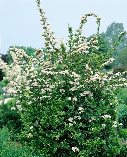 Pyracantha ‘Red Column’, der immergrüne Feuerdorn, ist ein charakterstarker Zierstrauch (Pyracantha coccinea), der mit aufrechtem, säulenförmigem Wuchs und dichter Verzweigung als Blütenstrauch und Gartenstrauch begeistert. Im späten Frühjahr erscheinen zahlreiche weiße Schirmrispen, die im Sommer zu auffallend leuchtend roten Beerenfrüchten ausreifen und den Strauch bis in den Winter prägen. Das glänzende, dunkelgrüne Laub bleibt ganzjährig attraktiv, die kräftigen, dornigen Triebe sorgen für eine kompakte, standfeste Silhouette. ‘Red Column’ erreicht mittlere Höhe bei relativ schmaler Breite, was ihn sowohl für schmale Beete als auch für architektonische Pflanzungen prädestiniert.