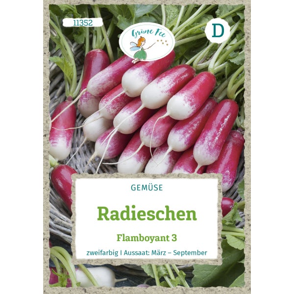 Zweifarbiges Radieschen für die gesamte Freilandsaison mit großen, länglichen Knollen mit weißer Spitze und mildwürzigem Geschmack. Radieschen können auch gut im Kübel oder Balkonkasten gezogen werden. Lecker in dünnen Scheiben mit Frischkäse auf dem Brot oder im Salat.