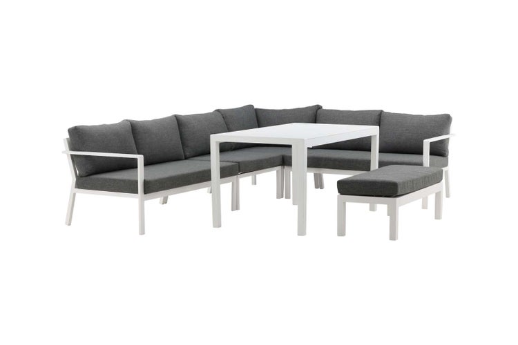 Ramos Lounge-Set 3-teilig grau, weiß ist ein Lounge-Möbel in der Farbe Grau, das sowohl Stil als auch Funktionalität in Ihr Zuhause bringt. Ramos Lounge-Set 3-teilig grau, weiß. Ecksofa grau inkl. Kissen, inkl. Fußhocker, B x H x T cm: 294/210/66/80, Sitzhöhe cm: 30, Sitztiefe cm: 72. Tisch weiß, B x H x T cm: 82/73/140. Dieses Produkt wurde mit viel Liebe zum Detail hergestellt, was sowohl Ästhetik als auch hohe Haltbarkeit gewährleistet. Bei der Gestaltung wurde sowohl auf Funktionalität als auch auf Stil geachtet, was es zur perfekten Wahl für jeden Raum in Ihrem Zuhause macht. Die verwendeten Materialien sind von hoher Qualität, was dem Produkt eine lange Lebensdauer verleiht und dafür sorgt, dass es dem täglichen Gebrauch standhält. Ob zur Aufbewahrung oder als dekorative Ergänzung, dieses Produkt wertet Ihre Einrichtung auf und bringt zusätzlichen Komfort und Eleganz in Ihr Zuhause.
