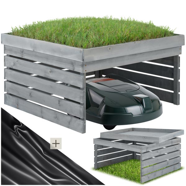 Entdecke die Rasenmäher-Roboter-Garage Hortus von tectake – eine charmante und praktische Lösung für Deinen Garten.Das wetterfeste Gestell ist aus langlebigen und gebeizten Kiefernholzlatten gefertigt und kann universell für zahlreiche Roboter-Modelle eingesetzt werden. Es bietet Deinem selbstständigen Rasenmäher somit eine sichere Überdachung und schützt zuverlässig vor Regen, Hagel und Sonneneinstrahlung.Ein besonderes Highlight ist das große Dach, das je nach Geschmack mit Steinen befüllt oder auch mit Gras, dekorativen Blumen und Ähnlichem bepflanzt werden kann. So fügt es sich harmonisch in jeden Außenbereich ein und sorgt für einen natürlichen Look. Dank der abdichtenden Folie bleibt der Innenraum des Unterstands Hortus von tectake zudem stets trocken und das Holz ist sicher vor Verwitterung.
