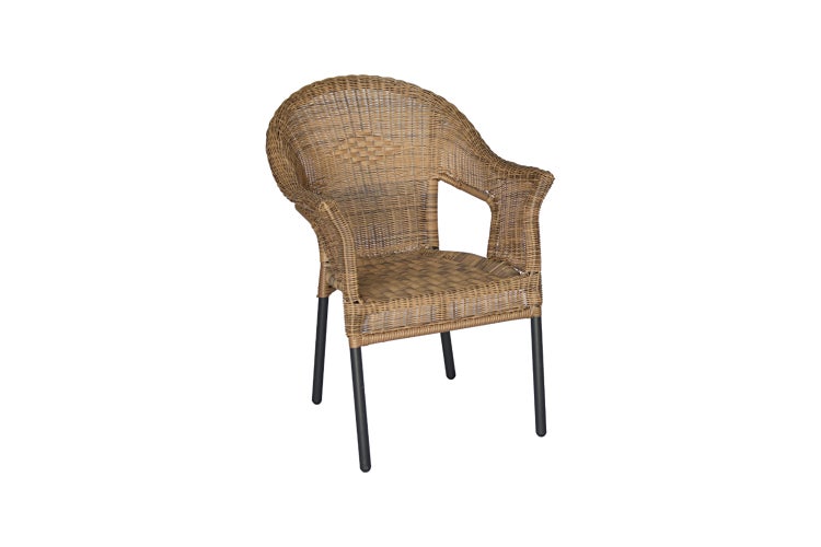 Die Sessel mit einenm graphitfarbenen Gestell und einem naturfarbenen Geflecht lassen sich platzsparend übereinander stapeln.