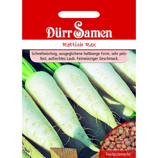 Info: Rettich Rex ist ein schnellwüchsiger, homogener Bund- und Stückrettich. Sehr pelzfest mit feinwürzigem Geschmack. Ertragreich und bewährt.