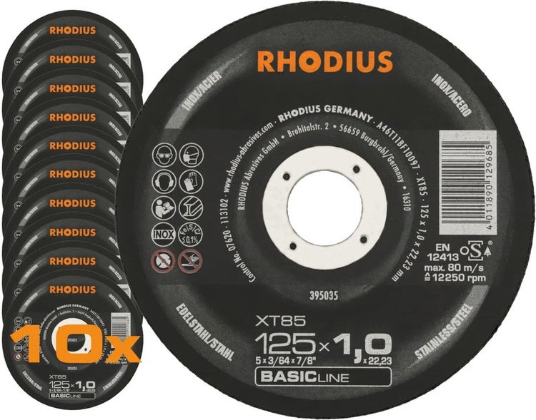 RHODIUS Trennscheibe XT85, 10 Stück, 125 x 1,0 x 22,23 mm für Edelstahl, Stahl, Metall, BASICline