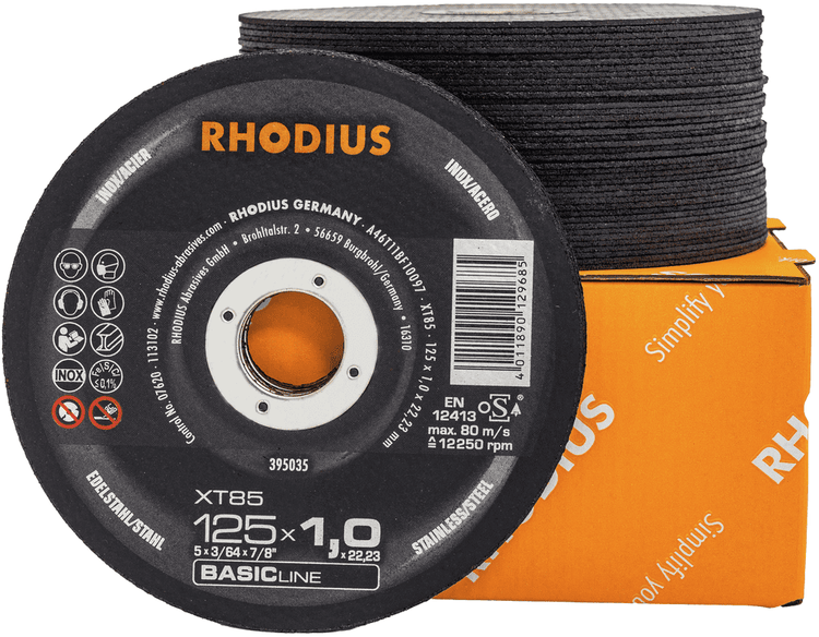 RHODIUS Trennscheibe XT85, 50 Stück, 125 x 1,0 x 22,23 mm für Edelstahl, Stahl, Metall, BASICline