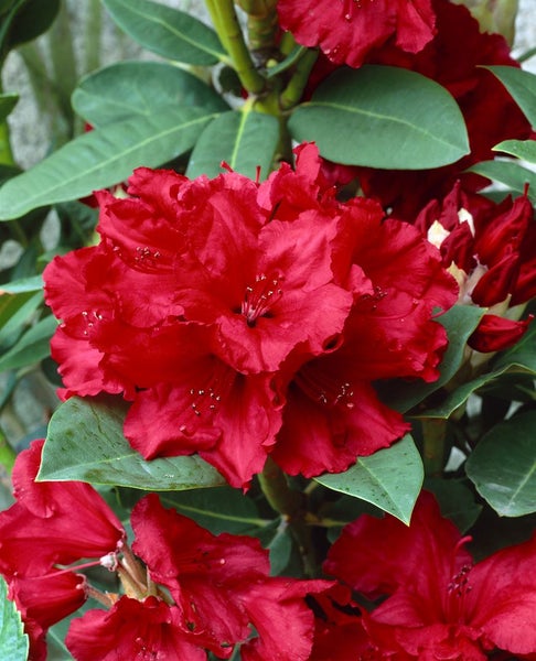 Rhododendron Hybride ‘Cherry Kiss’, der auch als Rhododendron oder Alpenrose bekannt ist, präsentiert sich als immergrüner Blütenstrauch mit außergewöhnlich intensiven, kirschroten Blüten, die in dichten Dolden von Mai bis Juni erscheinen und durch eine feine, dunklere Zeichnung besonders edel wirken. Das glänzend dunkelgrüne Laub bildet einen attraktiven Kontrast und bleibt ganzjährig dekorativ, während der kompakt-aufrechte, rundliche Wuchs den Zierstrauch zu einer idealen Wahl für kleinere Gärten macht. Als vielseitiger Gartenstrauch überzeugt ‘Cherry Kiss’ im halbschattigen Beet, im Heide- oder Waldgarten, im Vorgarten sowie als Solitär, in der Gruppenpflanzung oder als niedrig gehaltene Heckenpflanze. Auch als Kübelpflanze auf Terrasse und geschütztem Balkon setzt die Sorte elegante Farbakzente und sorgt in Kombination mit Farnen, Hostas oder anderen Moorbeetpflanzen für harmonische Pflanzbilder. Bevorzugt wird ein humoser, durchlässiger, gleichmäßig frischer Boden mit niedrigen pH-Werten; kalkhaltige Substrate sollten gemieden werden. Eine gleichmäßige, aber nicht staunasse Wasserversorgung und eine lockere Mulchschicht unterstützen die Wuchsfreude, während ein windgeschützter, lichtschattiger Standort mit Morgen- oder Abendsonne die Blütenpracht fördert. Leichte Formschnitte direkt nach der Blüte erhalten die dichte Verzweigung, und eine sparsame Gabe von Rhododendron-Dünger im Frühjahr stärkt Vitalität und Knospenansatz. Mit seiner kompakten Eleganz, dem immergrünen Laubkleid und der leuchtenden Blüte ist Rhododendron ‘Cherry Kiss’ eine charakterstarke Wahl für stilvolle Gartenräume.
