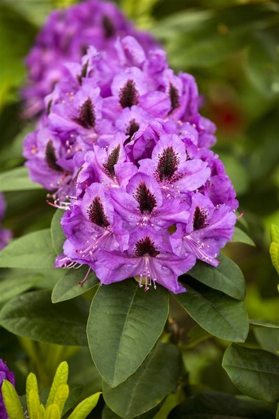 Rhododendron Hybride ‘Orakel’, die immergrüne Alpenrose, begeistert als eleganter Blütenstrauch mit intensiver Ausstrahlung und zuverlässiger Gartenwirkung. Die großen, trichterförmigen Blüten öffnen sich von Ende Mai bis Juni in sattem Purpurviolett mit dunkler Zeichnung im Schlund und sitzen in dichten Dolden über glänzend tiefgrünem Laub. Der Gartenstrauch wächst kompakt, rundlich und dicht verzweigt, bleibt dabei mittelstark im Zuwachs und entwickelt sich zu einem formschönen Solitär, der auch in Gruppenpflanzung harmonisch wirkt. Als Zierstrauch setzt ‘Orakel’ in Beeten, im Vorgarten oder im halbschattigen Gehölzrand starke Akzente; ebenso eignet er sich als lockere Heckenpflanze mit saisonaler Blütenfülle oder als edle Kübelpflanze auf Terrasse und Eingangsbereich, wo seine immergrüne Präsenz das ganze Jahr Struktur bietet.