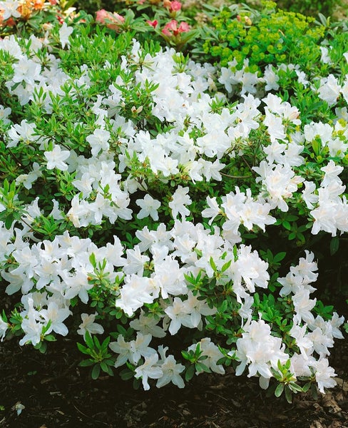 Als vielseitige Kübelpflanze macht diese Azalee auf Terrasse und Balkon ebenso Eindruck wie im Vorgarten, im Heide- und Steingarten oder im klassischen Rhododendron-Beet. In Gruppenpflanzungen entsteht ein eindrucksvoller, farbintensiver Teppich; als Solitär setzt sie edle Akzente an Eingängen oder vor immergrünen Gehölzen. Ein halbschattiger bis lichtschattiger Platz ist ideal, gern mit Morgen- oder Abendsonne und Schutz vor der grellen Mittagssonne. Der Boden sollte humos, locker, gleichmäßig feucht und deutlich sauer sein, kalkarm und frei von Staunässe. Eine flache Pflanzung mit saurem Mulch aus Rindenhumus fördert das feine Wurzelwerk, regelmäßiges, maßvolles Gießen mit weichem Wasser erhält die Blühfreude. Nach der Blüte empfiehlt sich das Ausputzen verwelkter Blütenstände, ein Formschnitt ist kaum nötig. In Kombination mit Farnen, Funkien oder japanischem Ahorn entstehen harmonische, elegante Pflanzbilder.